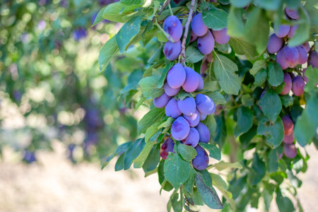 Close up of ripe purple plums growing on a tree branch in an orchard, bathed in warm sunlight