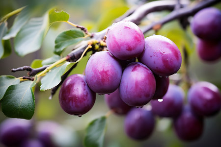 Fresh plums on tree branch with green leaves. Close-up food photography with natural background