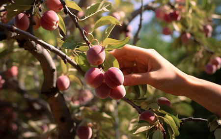 Farmer picking ripe plum fruit tree from the branch in orchard, selective focus