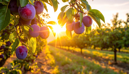Delicious ripe plums on tree branches in a serene orchard at dusk