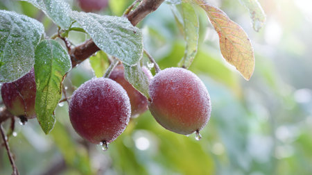 Two plums with vibrant colors rest on a branch, adorned with sparkling raindrops. The lush green leaves create a refreshing backdrop, indicating a recent rainfall.