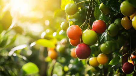 A close-up view of fresh, ripe fruits hanging from the branches in a lush fruit garden, with a focus on their vibrant colors and textures.