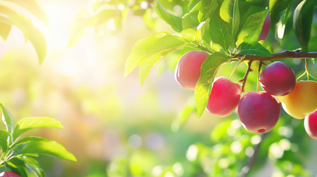 A beautiful scene of ripe plums on a branch, soaking in warm sunlight. Lush green leaves surround the juicy fruit, embodying a serene garden atmosphere.
