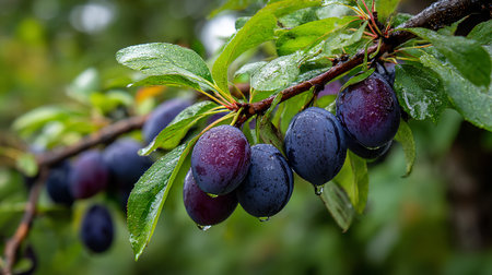 This close-up image features fresh ripe plums hanging on a tree, surrounded by lush green leaves with water droplets that add a refreshing touch.