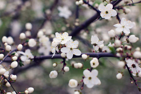 on the branches of the cherry plum tree, there are many white, delicate flowers that bloomed in early spring.in the rays of the setting sun. seasonal trend