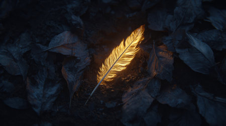 Glowing feather rests on bed of dark, decaying leaves, creating striking contrast between light and shadow. scene evokes sense of mystery and beauty in nature