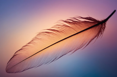 Delicate feathers gently resting soft surface, illuminated by warm sunlight, create serene and tranquil atmosphere. intricate details of feathers are highlighted, showcasing their natural beauty