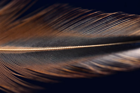 A stunning close-up image of a golden feather, showcasing intricate textures and natural patterns against a dark background, ideal for artistic designs.