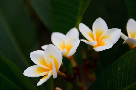 Flowers are blooming In the breeding season Has a green foliage background.white and yellow Plumeria