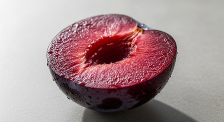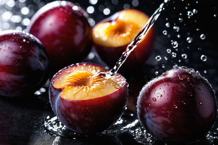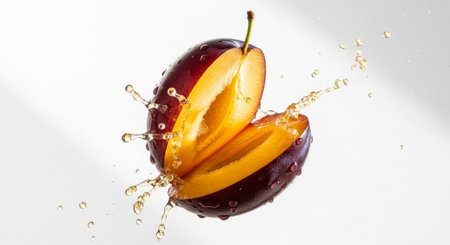 A vibrant purple plum is captured mid action, sliced in half with golden juice and water droplets splashing dynamically. The fresh fruit reveals its juicy yellow orange flesh against a clean white background, emphasizing its natural freshness and healthy appeal.