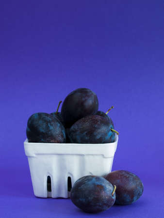Ripe purple plums scattered from the small decorative bucket on the white background.Close up with selective focus. Horizontal with copy space.