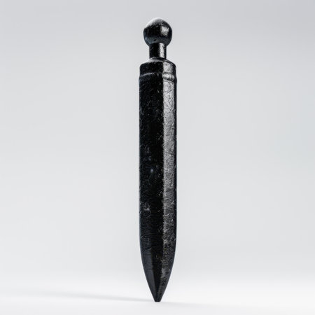 This image showcases a striking black spear-shaped object featuring a smooth finish and rounded top, ideal for modern decor. Perfect addition for artistic spaces.