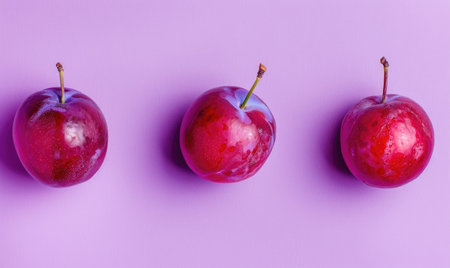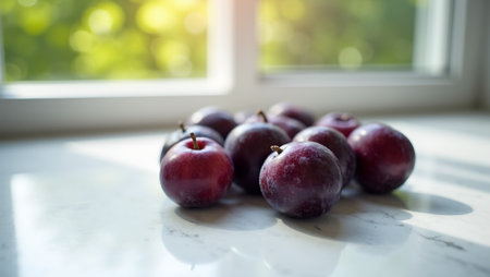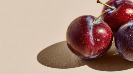 This image showcases fresh ripe plums resting on a warm-toned surface. The play of natural light creates appealing shadows and emphasizes the fruit's vibrant color and texture.