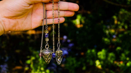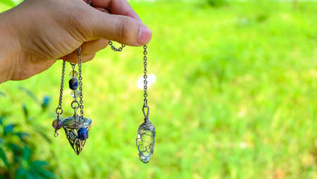 Foretelling the future with crystal pendulum. holding and using quartz crystal pendulum and using it, nature background.