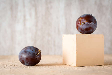 Creative still life. Ripe blue plum on a beige cube and one plum on the table. The importance of vitamins