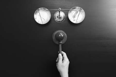 justice and law concept.Top view of Male judge hand in a courtroom with the gavel and brass scale on dark wood table,black and white