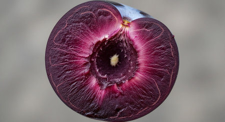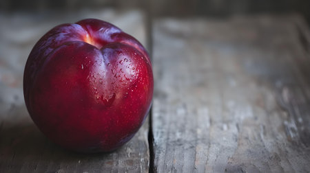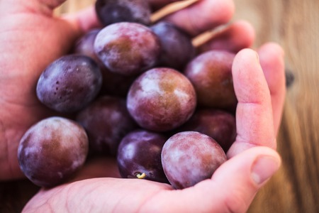 A person holds a wooden board with a purple plum on it. Concept of simplicity and natural beauty, as the fruit is the main focus of the scene. The wooden board adds a rustic touch to the
