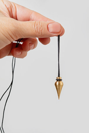 Brass pendulum held for energetic dowsing, used to sense subtle vibrations and read energy in holistic therapy, meditation, and alternative healing. Shows focus, balance, and spiritual intention.