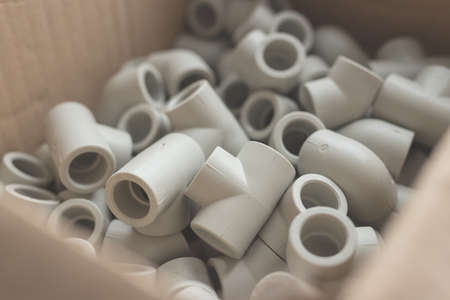 Fittings for installation of water supply from polypropylene in carton. White plastic tees for connecting branches in the water supply system