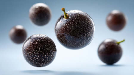 Stunning still life of floating dark berries with glistening water droplets against a soft blue background, perfect for promoting healthy eating and freshness.