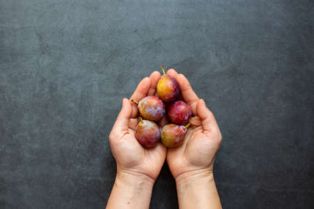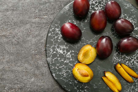 Fresh ripe plum fruits with water drops on stone concrete background, angle view