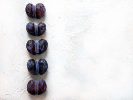 Ugly funny accrete plums on a light background. Flat lay. Copy space.