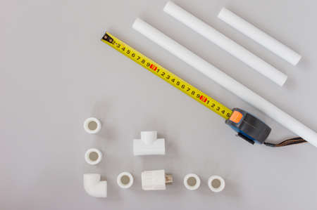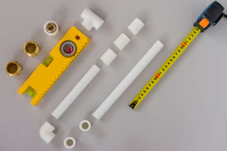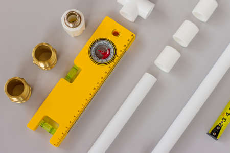 Plumbing fixtures and piping parts with measuring level and ruler. Plumbing flat lay concept background with copy space