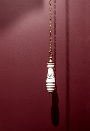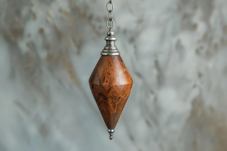 Wooden pendulum hanging on a chain, swaying slightly, against a blurred background
