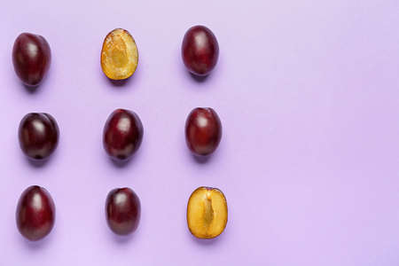 Ugly double plums or prunes on a purple background. Unusual deformed fruits can be used for food. Сoncept - reduce plant or food waste.