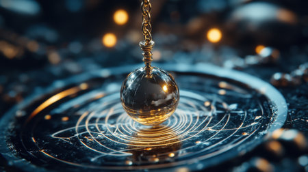 Mystical pendulum on a chain swings over a magic table. gold neon tones