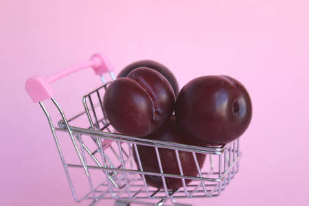 Fresh ripe plum fruits in plastic bag package on blue grey minimal background, top view