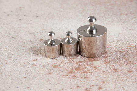 Antique weights for scales on concrete background. Copy space for text and food photography props.