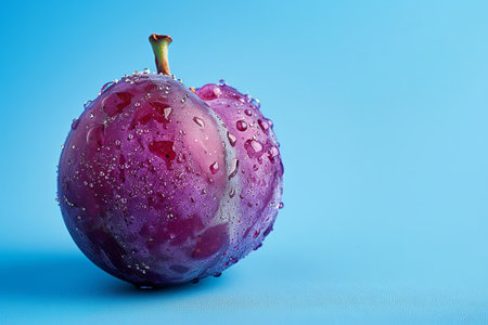 A single, plump purple grape rests on a clean white surface against a backdrop of clear blue sky. The grape is glistening with dew, highlighting its smooth, velvety skin. The image captures a moment of natural beauty, showing the simple elegance of a fresh fruit.
