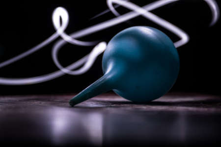 Blue enema on dark background with backlight. Creative artwork decorated with light. Selective focus