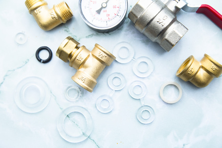 Various plumbers tools, pipe fittings on a home improvement plumbing materials including copper pipe, elbow joint, wrench and spanner.