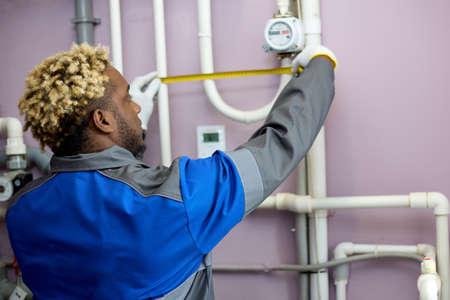 African American man in overalls carefully takes measurements with a tape measure. Professional installer measures the distance between the pipes in the boiler room using a measuring tape measure