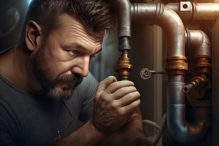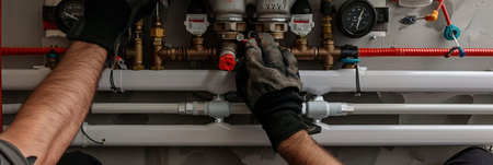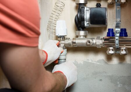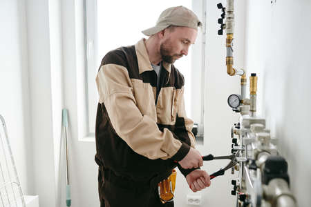 Expert technician inspecting and repairing central heating system with tools in home water systems