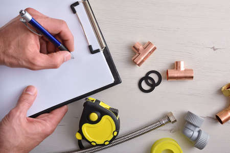 Review and preparation of plumbing material for a job with hands pointing on a notepad and plumbing material on a wooden table. Top view. Landscape composition.