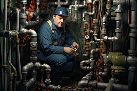 Resourceful Plumber man pipes basement. Work boiler heat. Generate Ai