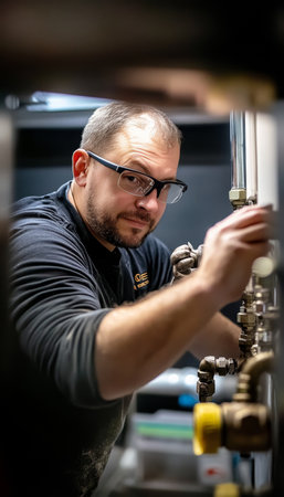 A professional is working on a faucet in a dimly lit utility room, focused on completing the repair task.