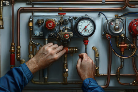 A skilled technician carefully adjusts a pressure valve in an industrial facility. The dim lighting highlights the precision of the work, showing the intricate details of the mechanism.