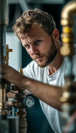 A technician focuses intently on repairing a complex industrial piping system in a factory setting.