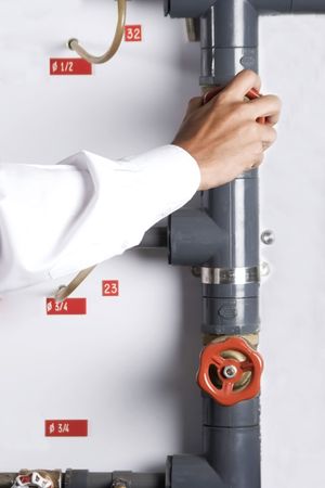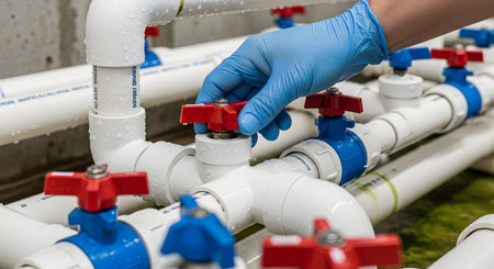A close-up of a worker's hand in a blue nitrile glove adjusting a red valve on a complex system of white PVC pipes. The setting appears to be an industrial facility or a water treatment plant, illustrating concepts of control, maintenance, and regulation.