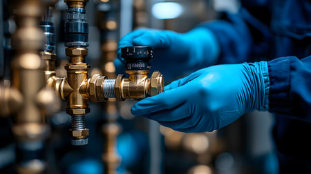 A professional plumbers hands in gloves securely connecting a water pipe to a valve, captured with sharp industrial lighting. Perfect for plumbing, construction, and maintenance-themed projects.