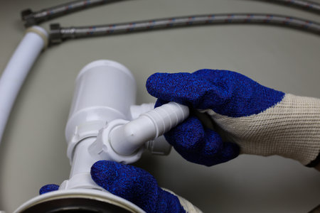 Plumber in gloves installs a plastic siphon, hands fixing white sewer pipes in the bathroom