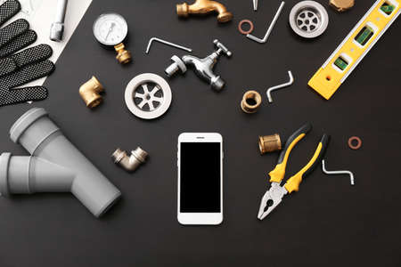 Mobile phone and plumber items on dark background