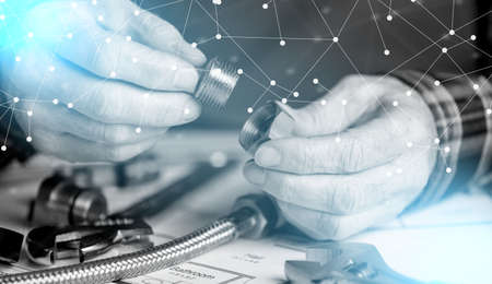 Plumber hands using plumbing fittings; light effect