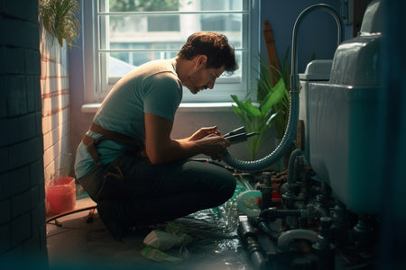 illustration of plumber Repairing water pipe in a bright bathroom with Generative AI