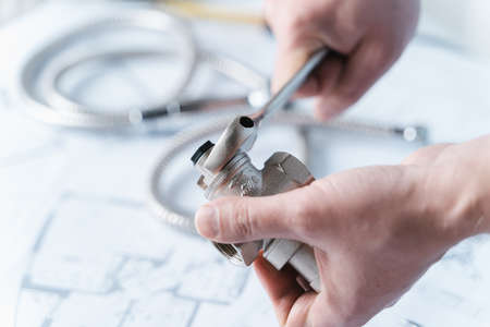 Plumbing project in house.Drawing,diagrams,plan of water supply of apartment,building.Man repairer making repairs at home.Devices,accessories, hose,tap,adjustable wrench,pressure reducer,tape measure.