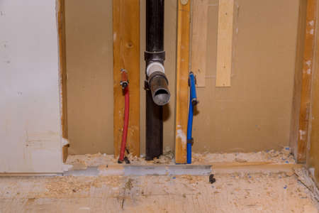 laundry room renovation with plaser walls interior exposed with taps and copper pipes, concept of home renovations and tradesman work